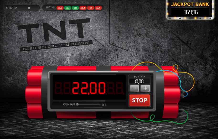 TNT è prodotto da Gioca Online e fa parte di quel gruppo di quick games adrenalinici e imprevedibili basati su nervi saldi e coraggio. Scopo del gioco è quello di “disinnescare” una bomba collegata a un timer prima che questa esploda. Più tempo passa, maggiore sarà la vincita ottenuta, ma occhio all’esplosione, che arriva imprevedibile e quantomai inaspettata.